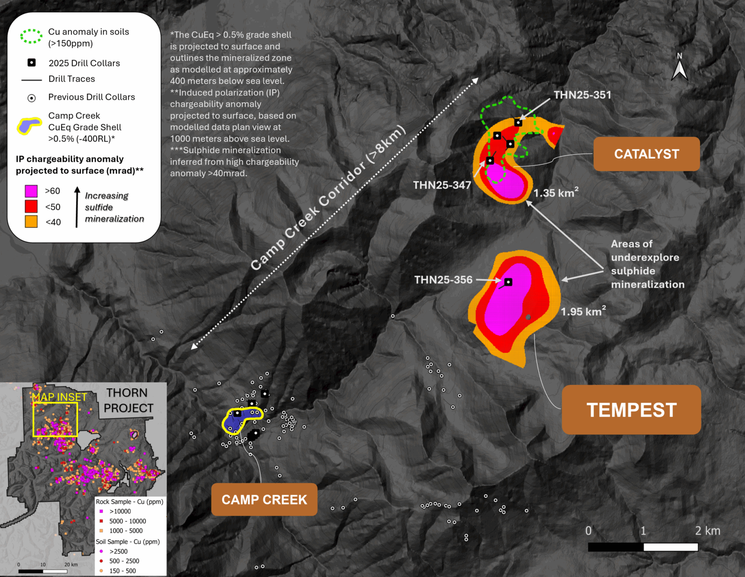 Chairman, CEO, Gary R. Thompson stated, “Intersecting two mineralized porphyry systems with our first-ever drill holes at both Catalyst and Tempest is a remarkable achievement and not something commonly seen in the industry. A big congratulations goes out to the Brixton team. These results underscore the exceptional prospectivity of the Camp Creek Corridor and reinforce our belief that the Thorn Project has the potential to host a large, multi-center mineralized system. The continuity of copper, gold, and silver mineralization, combined with strong geophysical signatures and classic porphyry-style alteration, highlights the importance of this underexplored district. We are excited to continue advancing exploration and further define the scale and grade of these promising new targets.”