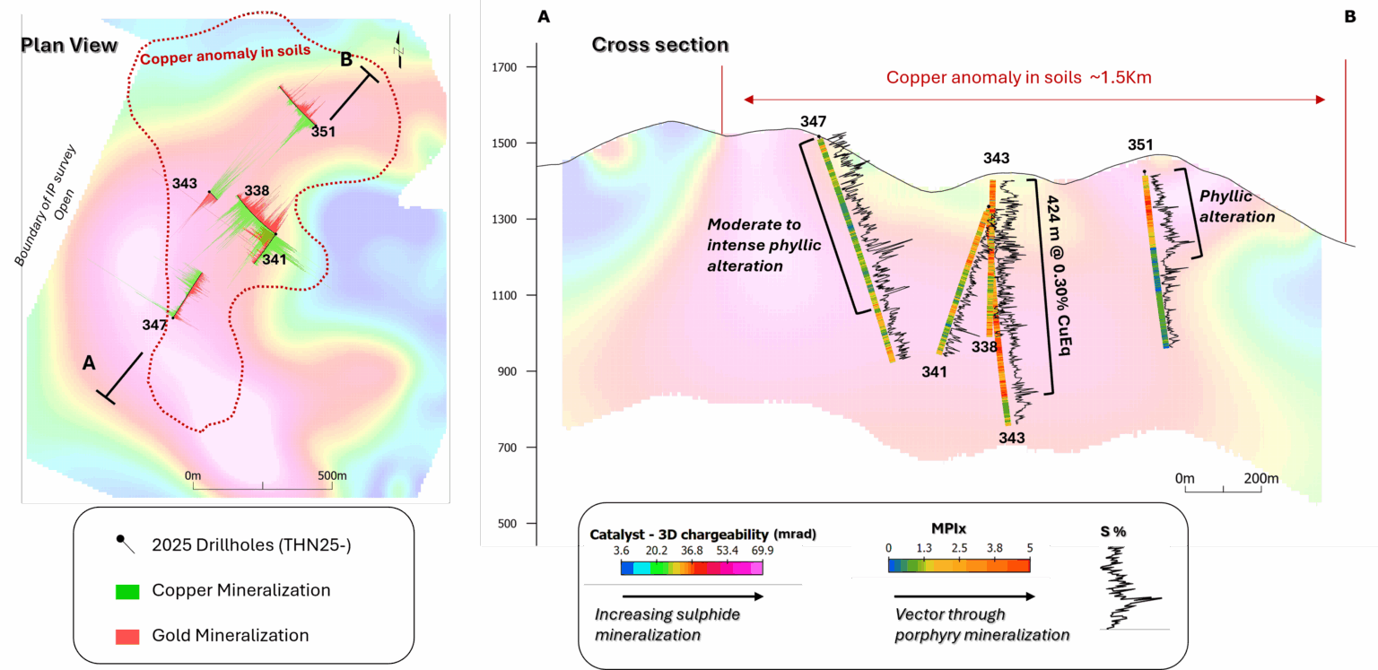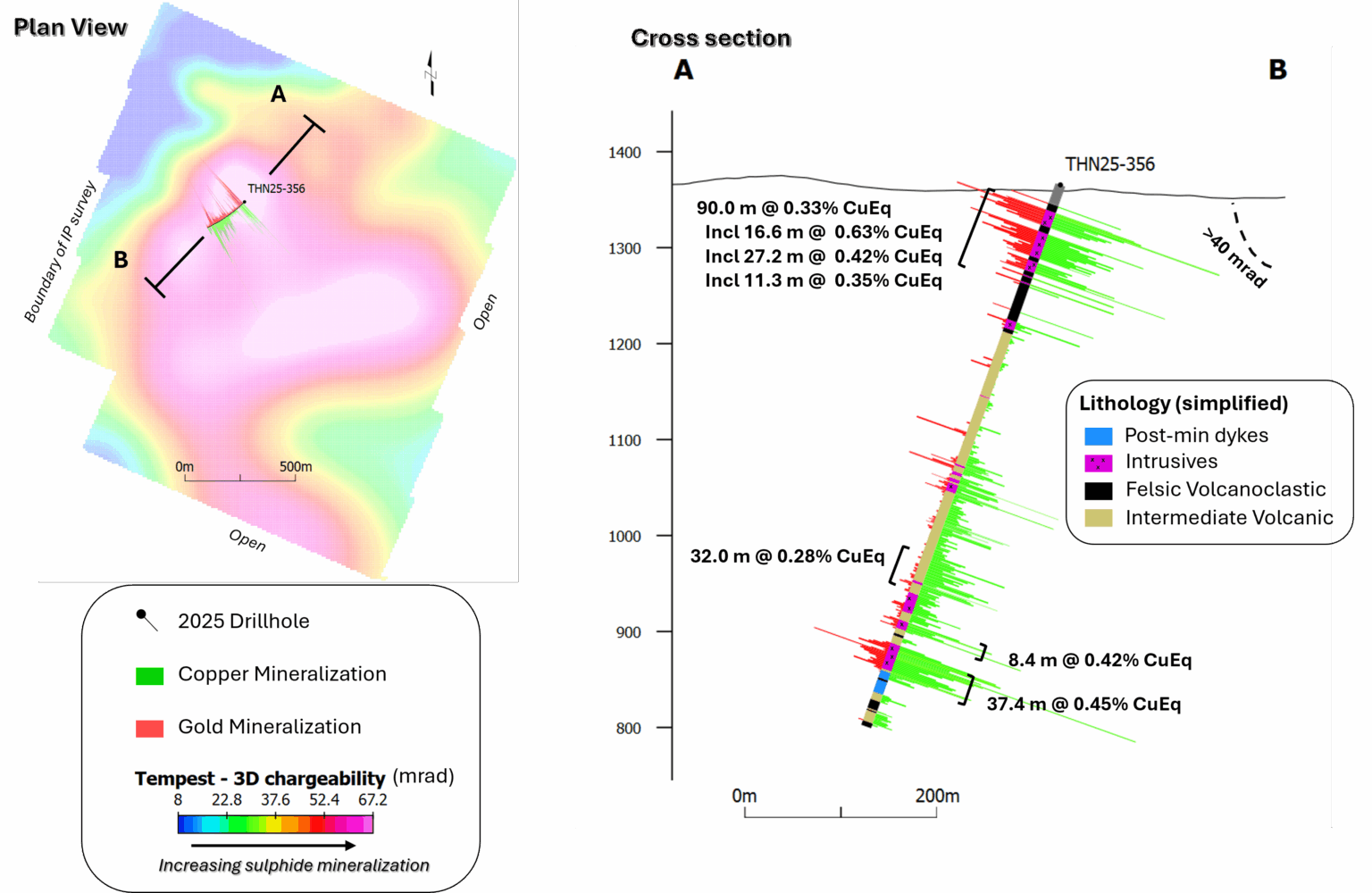 Figure 2. Map illustrating the extensive chargeability (IP) anomaly at Tempest, alongside a cross-section of drill hole THN25-356 that highlights the simplified geology and zones of copper and gold mineralization.