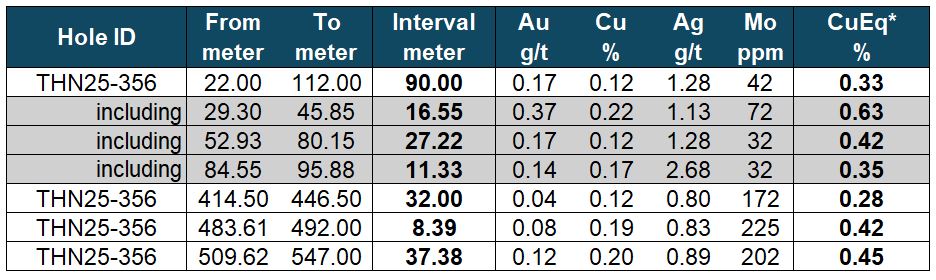 • Hole THN25-356 returned 90.00meters of 0.33% CuEq from22.00 meters